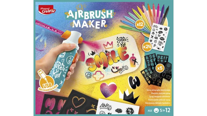 Indeholder: 1 genopladlig spray, 1 stk USB kabel, 2 ikonskabeloner, 3 bogstavsskabeloner, 12 farver, 1 sæt klistermærker, 5 stks A5 papir, 1 planche