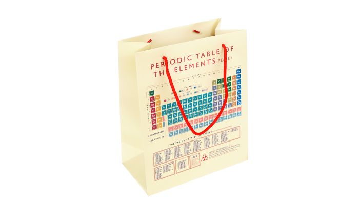 Periodiske system gavepose er et praktisk alternativ til indpakningspapir. Fantastisk til naturvidenskabelige entusiaster eller som prikken over i'et på en lærers gave. Fås også i en større størrelse.