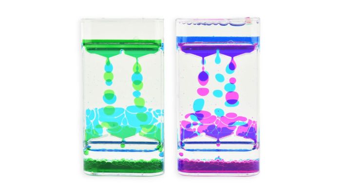 Et visuelt stimulerende flydende timeglas. Vend glasset, og se, de små lavalignede bobler pible rundt i forskellige farver. Boblerne går fra store til små og du kan blive helt afslappet at observere dem.