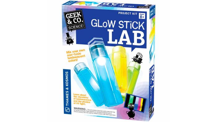 Med laboratoriesættet ”Glow Stick Lab” får du alle de beholdere og kemikalier du skal bruge for at kunne lave dine egne knæklys og selvlysende krystaller. Sættet indeholder sikre rør og skruepropper du skal bruge til at opbevare dine selvlysende opløsninger, en smart led-lampe top til dine knæklys, så du kan genoplade dem hvis de mangler belysning og pakker med de kemiske stoffer du skal benytte for at lave de fem forskellige forsøg*.
