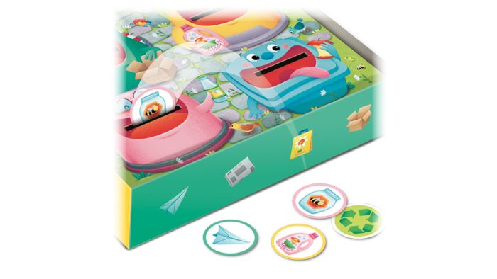 Indeholder 32 affaldsbrikker (16 par) i fire kategorier: papir, plast, glas og organisk affald