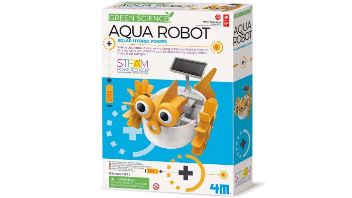 Se denne Aqua Robot svømme af sted, når sollyset skinner på dens solceller. Aqua Robot kan drives ved hjælp af batteri, når der ikke er sollys.