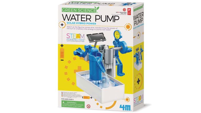 Produkt: Eksperiment-/byggesæt med solcelledrevet og batteridrevet vandpumpe