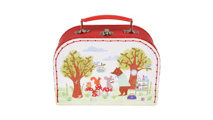 Lægekuffert til de mindste med redskaber i lyst træ. Et flot sæt, der er ideelt til leg og læring. Sættet består af 7 redskaber, der ligger op til fantasifuld og lærerig leg som læge eller dyrelæge. Alt sammen i en flot kuffert med illustration af skovens dyr.