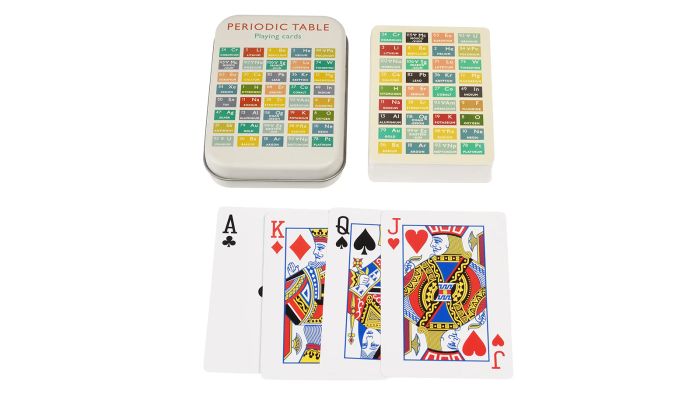 Et sæt spillekort i en periodisk system æske.