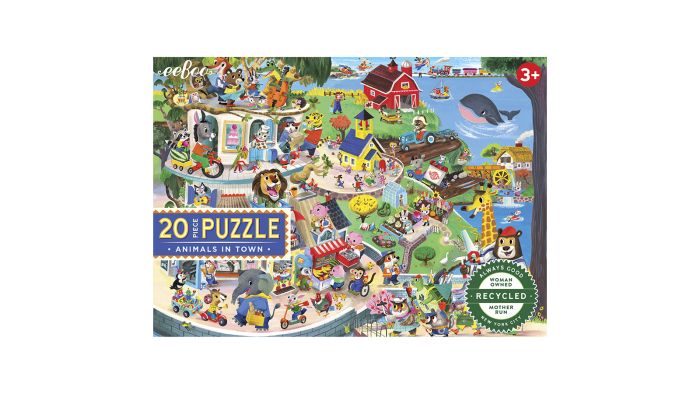 Tag på en hyggelig opdagelsesrejse gennem byen med eeBoos smukke puslespil Dyr i byen. Her møder børn de sødeste dyr, der har fundet vej ind blandt gader og huse – og måske på café eller i parken. Puslespillet har 20 store, robuste brikker, som er perfekte til små hænder, og de farverige illustrationer gør det ekstra sjovt at samle.