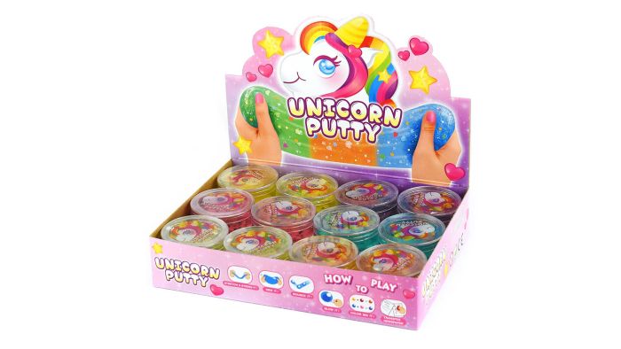 Med Putty Unicorn Glitter kan du trække, klemme og strække dig helt ind i et enhjørningeunivers fyldt med glimmer og eventyr. Denne funklende putty er perfekt til små hænder, der elsker at mærke, hvordan den levende masse smyger sig mellem fingrene – og efterlader et drys af ren enhjørningemagi i sindet.