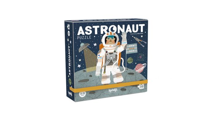 Her får du et flot puslespil til de unge hjerner. Selvfølgelig med et fantastisk motiv, en vinkende astronaut, på rumrejse. Når du er færdig, kan du lægge brikkerne i den flotte dåse til du igen vil lege med puslespillet.