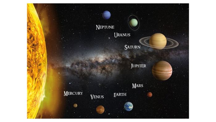 Flot 3D-effekt postkort med alle vores planeter, Solen og Mælkevejen i baggrunden.