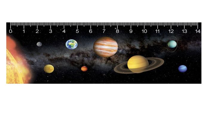 3D-effekt lineal med solen og alle planeterne, dog ikke i rækkefølge.