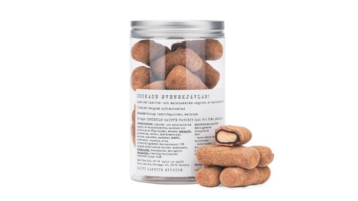 Lakrids- og salmiakcreme omgivet af saltlakrids, salmiak, belgisk mælkechokolade og lakridspulver. Svenskjävlar dyppet i belgisk mælkechokolade og rullet i lakridspulver.