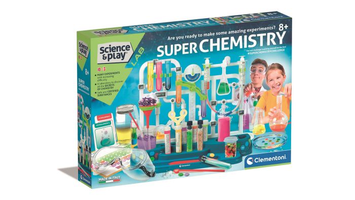 Super Chemistry fra Clementoni er et eksperiment-sæt, hvor børn kan udforske kemiens magiske verden gennem farveskift, bobler, krystaller og sjove reaktioner. Her bliver simple kemiske principper gjort legende og spændende, så børn både lærer og fascineres.